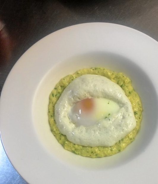 Huevo mollet sobre revuelto de huevos al queso azul