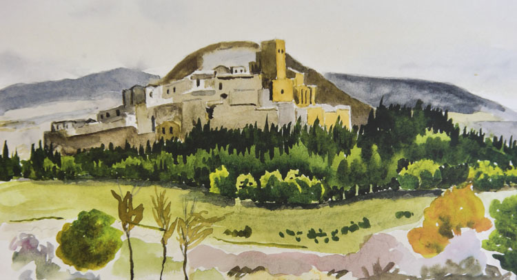 Osés repite visitas a lugares como la arruinada Venta del Moro de Eslaba, junto a las viejas piedras de lo que fue ermita. Su amplia colección de acuarelas incluye alguna escapada al Alto Tajo o la playa gerundense de S’Agaró –«una excepción porque la playa de aquí no me atrae nada, siempre hay gente. Busco sitios recónditos y hasta misteriosos y ahí encontré ese espacio con apenas dos personajillos en la roca y me gustó»–.