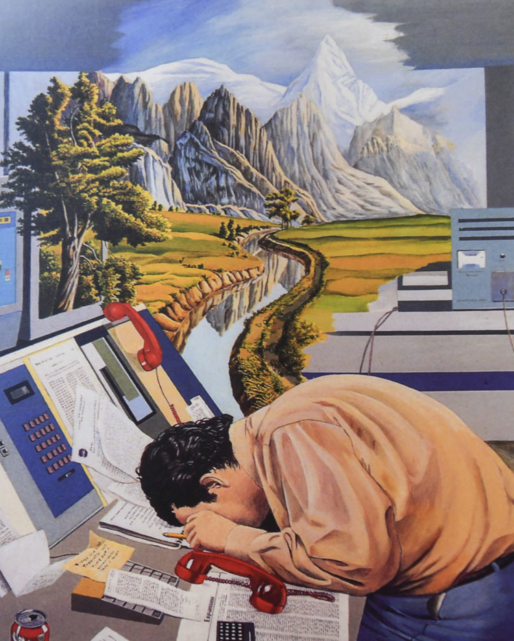 Pasó una etapa más esotérica, lindando con lo espiritual (años después dibujaría al filósofo Jiddu Krishnamurti) y trabajando al aire libre. Con protagonismo en sus cuadros para algún indio americano, animales silvestres o la activista californiana Julia Hill, que vivió 738 días en una secuoya de 1500 años para que no la talaran. Un talante ecologista que se reflejó en motivos como “A esta velocidad nos la vamos a pegar. Abiadura honetan pikutara goaz”.