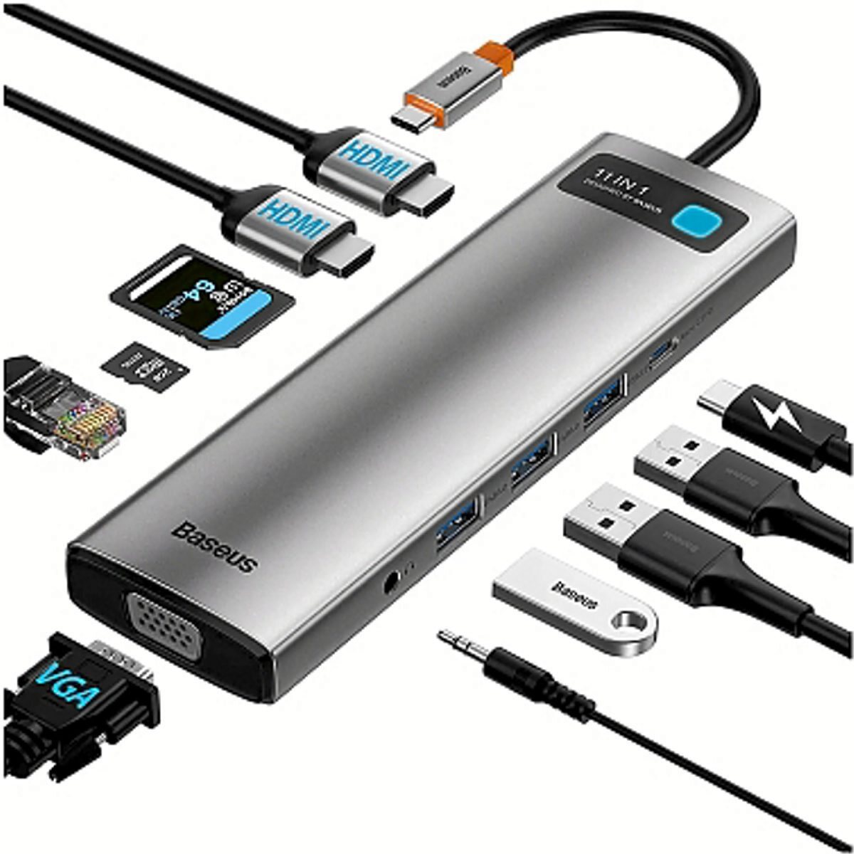 Ocupando un solo USB-C, los hubs de Baseus pueden añadir hasta once puertos a un ordenador para suplir carencias o averías, ya que cuenta con puertos HDMI 4K y VGA, RJ45 para redes cableadas, USB-A para unidades o periféricos externos, jack de audio y lector de tarjetas.