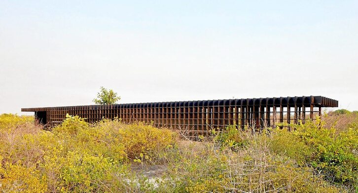Una escultura negra. Para recrear el mundo ascético e incoloro de las lejanas playas mexicanas, las tablas de madera –utilizadas para realizar la estructura y envolvente del edificio– fueron carbonizadas, un método tradicionalmente practicado en la parte occidental de Japón. Además de dotar de abstracción al conjunto, gracias al negro intenso de la madera quemada, ese tratamiento de carbonización protege la madera del clima y de la salinidad el mar.
