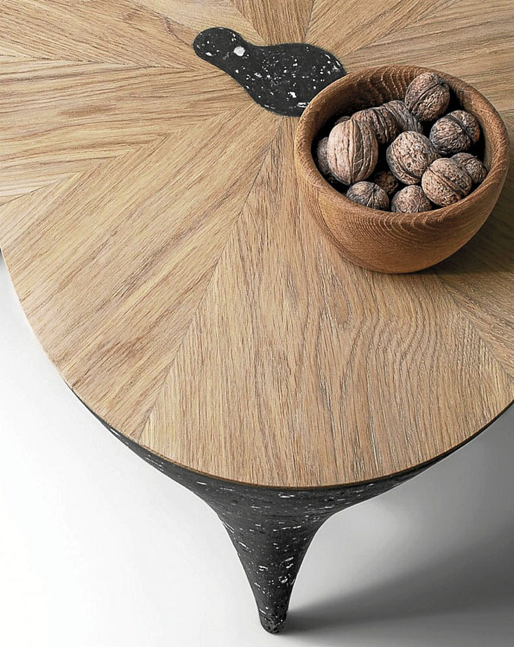 Hay materiales que asociamos con ciertas emociones y conceptos. El agua puede ser calmante y limpiadora, mientras que el plástico es suave y flexible. La madera es cálida y acogedora, mientras que la piedra es fría e impersonal. Estos dos últimos se unen de una manera armoniosa en esta mesa de centro. Diseñada por Donatas Zukauskas, Side Table roza lo escultórico utilizando materiales opuestos o contrastantes que consiguen darle una personalidad distinta, como una especie de carácter Yin y Yang. La parte superior de madera ancha y de forma irregular está sostenida por tres patas cónicas que terminan en pies muy delgados. Su forma tiene elementos de estabilidad e irregularidad como si nos desafiara a decidir si es estable o va a colapsar. Lo que la hace aún más interesante es que las patas no están hechas de hormigón real, sino de una masa de papel que de nuevo es lo contrario de la rigidez del hormigón, pero se mezcla con otros materiales para darle la textura, resistencia al agua y rigidez deseadas.