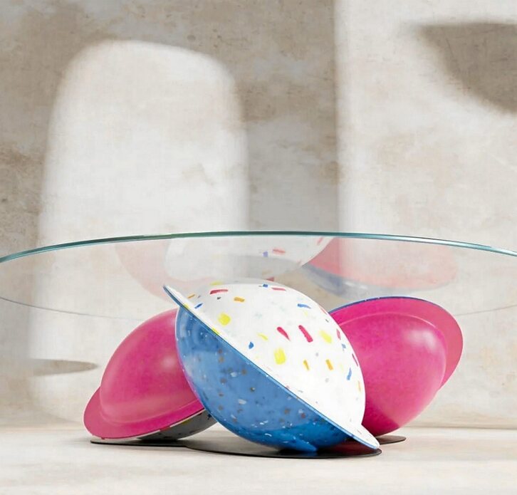 Cuando los adultos hablamos de extraterrestres y platillos voladores, a menudo imaginamos criaturas espeluznantes. Los niños, por el contrario, normalmente tienen ideas más divertidas sobre nuestros vecinos interplanetarios, evocando imágenes llenas de colores mucho más amables y divertidas. Flying Soucer es una mesa de centro producida por Duffy London que combina vibrantes colores y patrones pop en una moda nostálgica y maximalista. En palabras de sus creadores, es «más una declaración de principios que anima a saltarse los convencionalismos y vivir la vida al máximo». Esta “fantasía sideral” ha sido fabricada a partir de tres grandes formas de ovnis de sabrosos colores dulces que sostienen en alto un disco de vidrio aún más grande que sirve como mesa. Debajo de los ovnis hay una placa base de acero que crea una sombra perpetua para los caramelos voladores, independientemente de la fuente de luz. El plástico termoformado utilizado en Flying Saucer proviene de materiales reciclados, particularmente de envases de alimentos que representan alrededor del 75 % de los residuos plásticos domésticos de Londres. En ese sentido, la mesa de centro es un recordatorio casi irónico de pensar en el planeta en el que estamos, incluso mientras miramos a los cielos en busca de inspiración.