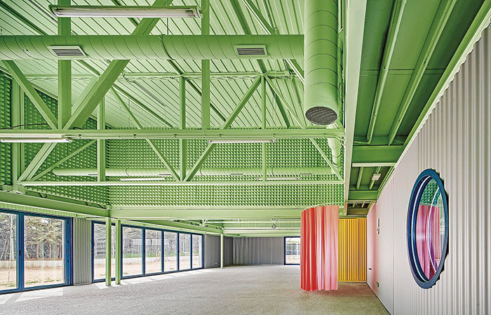 Materialen berrerabilera. Espezie arteko hartu-emanean arreta jartzeaz gain, eraikuntza-sistemen aukeraketan esfortzu handia egin da materialak berrerabiltzeko eta sorturiko hondakinak murrizteko. Esaterako, eraikinaren bolumenaren %30 itsas garraioko sei edukiontzik osatzen dute, estalkian ikus daitezkeenak. Horretaz gain, kontainer horietatik sobratutako xafla metalikoei probetxua atera zaie behe oineko fatxadaren kofratu gisa, horrela, hormigoiaren gainazalari testura uhindua emanez.