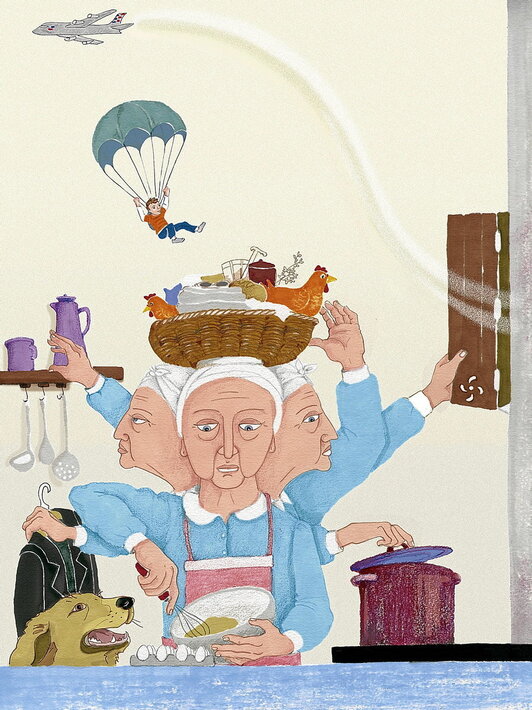 Eta algara behartuegi artean, «Eta zer? Begiratu bat eman?», orpoz orpo datorkion Georgek. «Jo, granny, berriro ogia? Ez al dago opilik edo zerealik? Ezta galletarik ere?».