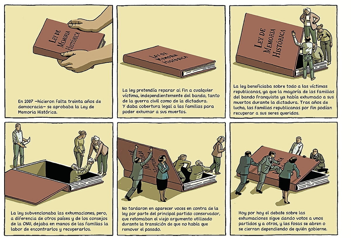 Dibujar los hechos fue para Roca un aprendizaje. «Al final haces cómics para reflexionar y aprender sobre temas que te parecen interesantes. Las fosas me interesan porque siguen creando revuelo político y nos dicen, ‘otra película sobre la Guerra Civil, ¿es que no vais a olvidar nunca?’. Pero ellos llevan la memoria histórica en primerísimo lugar, electoralmente y en su gestión».