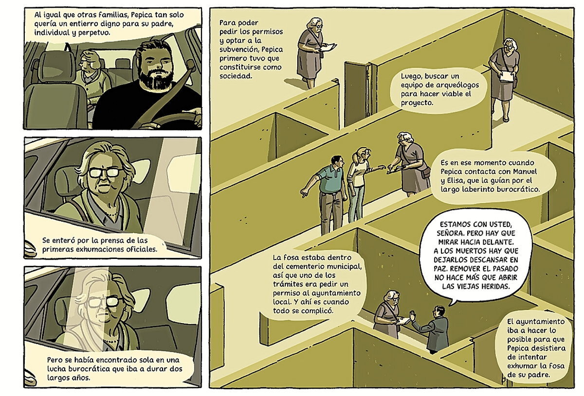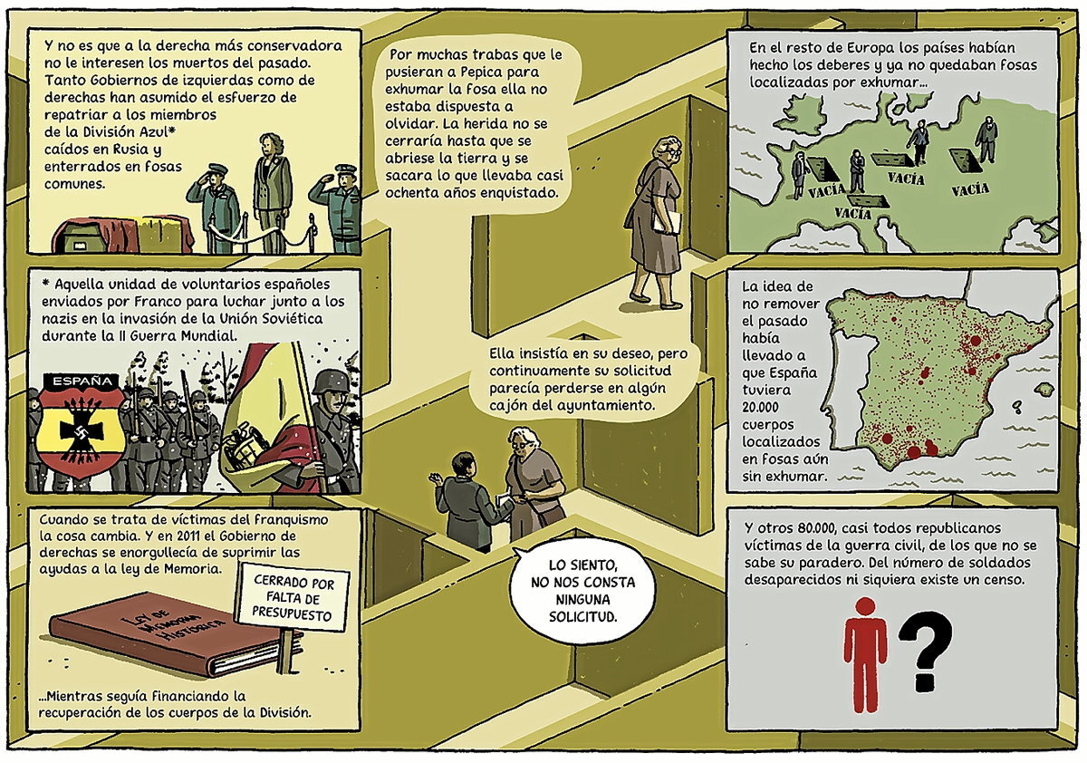 Pepica Celda tenía ocho años cuando fusilaron y enterraron a su padre en una fosa común y ha luchado por rescatar los restos. El reconocido dibujante Paco Roca bucea de nuevo en los ecos de la posguerra, en compañía del periodista Rodrigo Terrasa. Su cómic «El abismo del olvido» recorre el laberinto de las víctimas por su dignidad.
