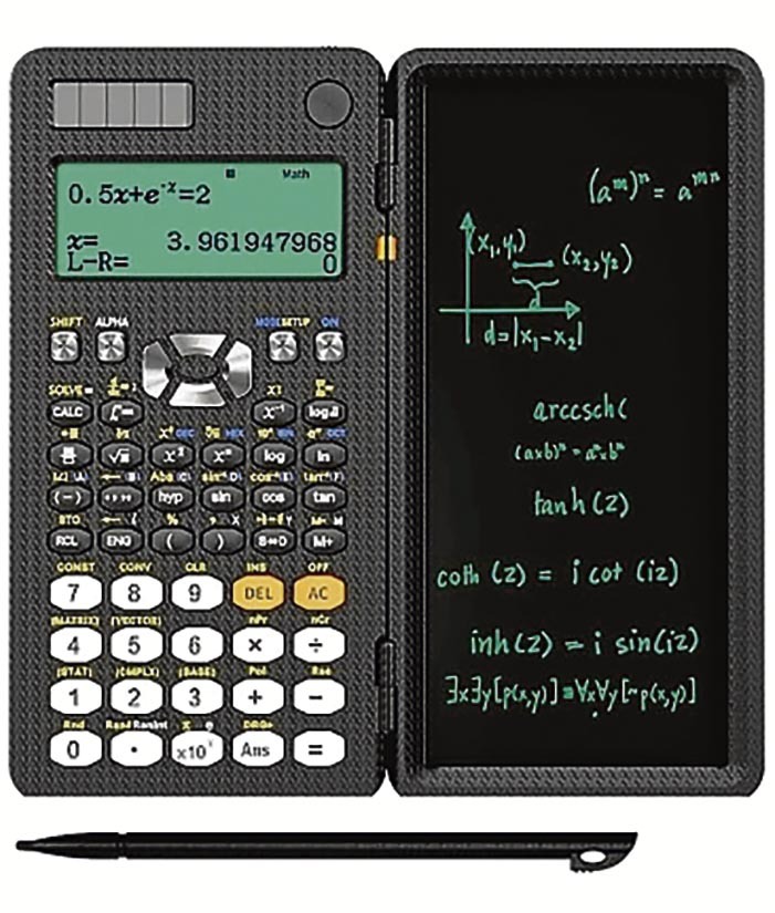 La firma NEWYES ofrece esta calculadora científica con una novedosa pantalla LCD plegable y un lápiz táctil que permite anotar nuestros cálculos, además de incluir todas las funciones habituales. Es compacta, fácil de transportar y cuenta con una batería de carga solar.