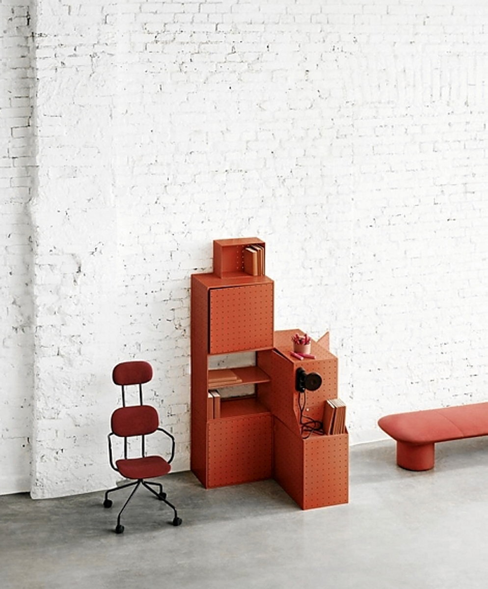 Los suecos String Furniture colaboran con el estudio de diseño Form Us With Love en Center center, un sistema de almacenamiento modular hecho de acero perforado para adaptarse a lugares de trabajo y espacios públicos. Center center ha sido diseñado para ser multifuncional y flexible, lo que le permite adaptarse a diferentes interiores. La idea detrás era reflejar las necesidades en constante cambio de los lugares de trabajo modernos, de hecho, el estudio había desarrollado Center center para su propio lugar de trabajo, probando las diferentes configuraciones del sistema con diferentes demandas. El centro está compuesto por placas delgadas de chapa metálica perforadas en una cuadrícula de 50x50x50 milímetros. Esto crea un patrón que le da al sistema de almacenamiento un aspecto minimalista e industrial. También permite a los usuarios añadir ganchos u otras soluciones de almacenamiento directamente a los muebles, creando más oportunidades para adaptar los módulos. Los módulos están disponibles en ocho colores y seis tamaños diferentes, para que los usuarios puedan diseñar soluciones de almacenamiento hechas a medida. Todos los tamaños y colores se pueden combinar tanto horizontal como verticalmente. Además, Form Us With Love también diseñó una serie de accesorios para Center center que incluyen puertas, estantes, patas, ruedas, bandejas, manijas y ganchos que dan a los diseños aún más adaptabilidad y permiten, por ejemplo, diseñar soluciones de almacenamiento que se pueden colocar fácilmente entre diferentes habitaciones.