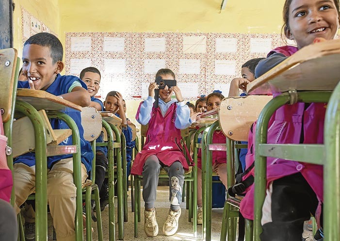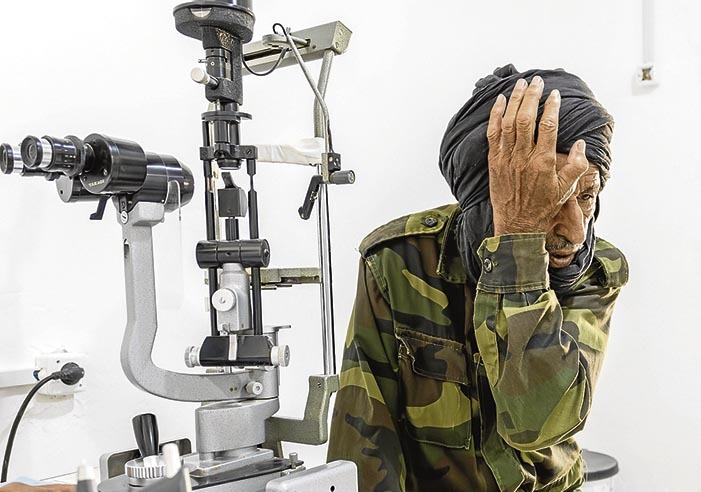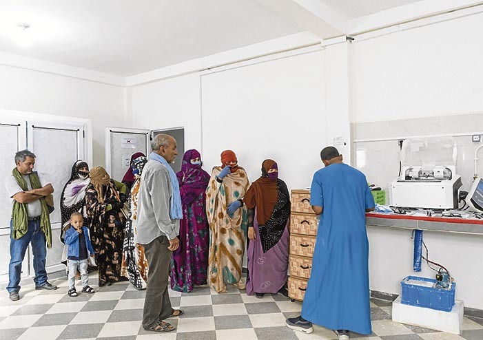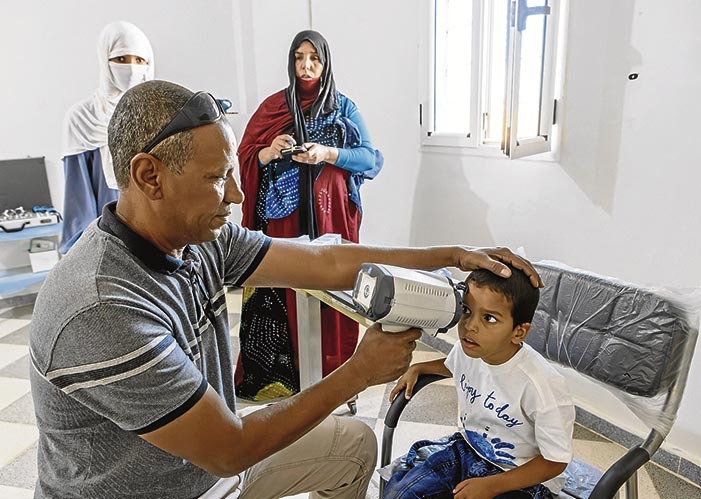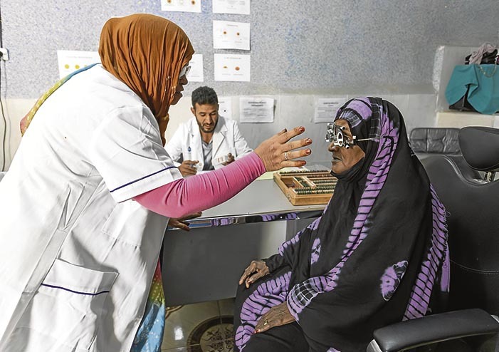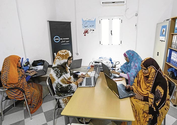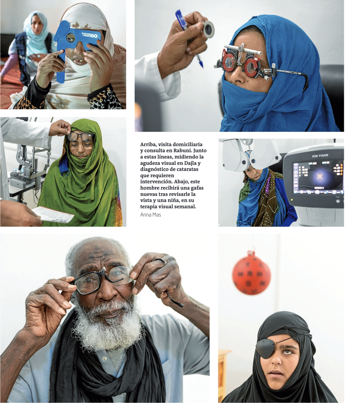 14 DéC. 2025 MUNDUKO BEGIAK Y LA SALUD OCULAR Mirando a los ojos del pueblo saharaui La importancia de la vista es indudable, ¿pero qué ocurre en los lugares desfavorecidos, donde escasean los medios? Munduko begiak es una ONG centrada en combatir la ceguera evitable que, desde hace veinte años, trabaja la salud ocular en algunos de estos sitios. Varios de sus voluntarios, que recientemente han visitado los campos de Tindouf, cuentan la experiencia. Una voluntaria de la asociación Basmat Khayr, que ha recibido formación para poder realizar pruebas oculares básicas. Anna Mas Miren Saenz La realidad del pueblo saharaui ha vuelto a dejarse oír coincidiendo con los 50 años de ocupación ilegal del Sahara Occidental por parte de Marruecos, que se cumplieron en noviembre. Privados del derecho a la autodeterminación, una condición que reclaman y por la que siguen luchando, el suyo es el segundo conflicto de desplazamiento forzoso más largo del mundo, por detrás del de Palestina, así que va y vuelve a la actualidad con altibajos. Este otoño, el aniversario ha traído a Euskal Herria a personas relevantes del movimiento saharaui como Fatma Mehdi, ministra de Cooperación de la República Árabe Saharaui Democrática (RASD), o Abdeslam Aomar Lahsen, presidente de Afapredesa (Asociación de Familiares de presos y desaparecidos), que presentó en Itsasmuseum su libro “Saharauis. Las otras víctimas del franquismo y del post franquismo”. Iñaki Elorza y Lourdes García, voluntarios de Munduko begiak, en la redacción de Gara-Naiz en Donostia. Jon Urbe | FOKU También este otoño, desde Donostia, han acudido a los campos de refugiados de Tindouf algunos de los integrantes de Munduko begiak, una ONG sin ánimo de lucro que trabaja por la salud ocular. Los vascos Iñaki Elorza y Lourdes García, junto con María Tavera -coordinadora de la Fundación Ojos del Mundo en los campamentos de población refugiada saharaui -, y Anna Mas -fotógrafa profesional, interesada en proyectos sociales y autora de las imágenes que ilustran este reportaje-, visitaron El Aaiun, Smara, Auserd, Dajla y Bojador, las cinco wilayas -provincias o asentamientos-, a la que hay que añadir Rabuni, centro gubernamental y administrativo, situadas al oeste de Argelia, y denominadas por los saharauis con los nombres de las poblaciones de la tierra que no les permiten habitar. A su regreso contactaron con 7K, Iñaki Elorza y Lourdes García pasaron por la redacción de Gara-Naiz, mientras simultáneamente, María Tavera y la coordinadora de Munduko begiak, Miren Rodríguez, lo hicieron por vía telefónica. El Centro Nacional de Oftalmología, ubicado en el Hospital Bachir Saleh, en Rabuni. Anna Mas Hay jubilaciones activas con muchas ganas de hacer cosas como lo demuestran las de Iñaki Elorza -periodista con una larga trayectoria como responsable de la sección de kirolak en Euskadi Irratia y más conocido como “Txapas”- y Lourdes García -profesora de música-. Ambos coincidieron en las Aulas de la Experiencia de EHU para mayores en Donostia y pensaron que, además de estudiar y relacionarse con gente, podían «ser útiles a la sociedad, sobre todo a través del voluntariado», comentan. Tras consultar distintas opciones, se decantaron por Munduko begiak, la versión vasca de Ojos del Mundo, una Fundación cuyo proyecto lo describe su propio nombre, ya que trabajan en el ámbito del cuidado y el tratamiento de la visión en países como Bolivia, Mozambique, Mali y en los Campamentos de población refugiada saharaui en Tindouf (Argelia). A Elorza y García una sola reunión les bastó para integrarse en la delegación vasca de esta Fundación, nacida en 2001 en Catalunya e impulsada por Rafael Ribó y Borja Corcóstegui, la primera comisión médico-quirúrgica cuya primera intervención fue precisamente en los campamentos saharauis. Su lucha es contra la ceguera evitable, aquella que se puede prevenir o curar en territorios vulnerables, y el lema que aparece en la portada de su página web es una declaración de intenciones: «Devolver la visión a las personas es el primer paso para que puedan verle un futuro a sus vidas. Y también otra forma de combatir la pobreza: mirándola a los ojos». Abajo, mujeres esperando a ser atendidas en la consulta de oftalmología situada en El Aaiun. Anna Mas DEMASIADOS MILLONES Munduko begiak cuenta con la ayuda de otros jubilados imprescindibles, como el oftalmólogo donostiarra Andrés Müller-Thyssen, que ha trabajado a menudo en Mali y que hace un año recordaba en cifras que en el mundo hay 1.100 millones de personas con pérdida de visión. De ellos, 43 millones están ciegos, 258 millones tienen una discapacidad visual moderada y 510 millones no pueden ver bien de cerca por falta de gafas. El 90% de estas personas viven en países de ingresos medios o bajos. Si no se invierte lo suficiente en salud ocular, se calcula que para 2050 la pérdida de visión afectará a 1.700 millones de personas. Iñaki Elorza y Lourdes García querían conocer el lugar, la situación y la gente por la que apuestan, así que decidieron realizar este viaje, por supuesto costeándoselo con dinero de sus propios bolsillos, para comprobar in situ que la vida es dura en ese desierto de puestas de sol espectaculares, donde la arena se mete por todos los lados, escasean los árboles, abunda la pobreza, sobra la basura, el agua la llevan en camiones de recogida de unas enormes balsas ubicadas en el suelo y sus habitantes se ven obligados a vivir de las ayudas. «Cuando estás trabajando en algo que en teoría desconoces, no te das cuenta de lo que estás haciendo. En nuestro caso era darnos a conocer, recaudar dinero si se podía, pero hasta ir a los campamentos no sabíamos realmente qué es lo que estábamos haciendo y para quién trabajamos. Y ahora, realmente ha sido compartirlo todo con todos los que estábamos allí», confiesa Elorza. Allí, esta ONG se encarga de cuidar de la salud visu