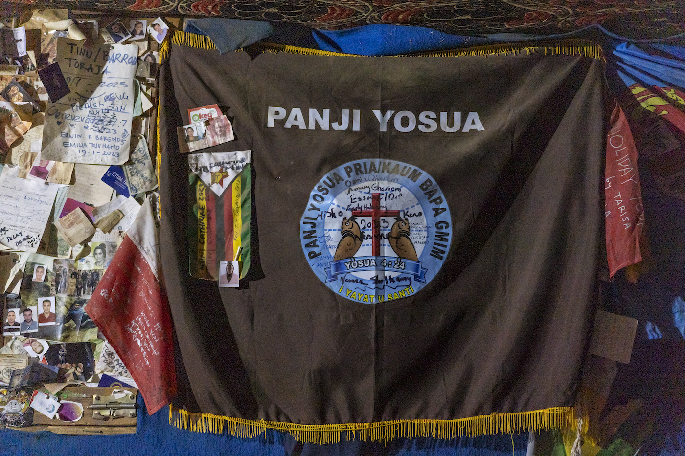 Mendiko igoeran dauden kafetegietako baten hormetan eskegitako banderak eta argazkiak. (Miguel Fernandez Ibañez)