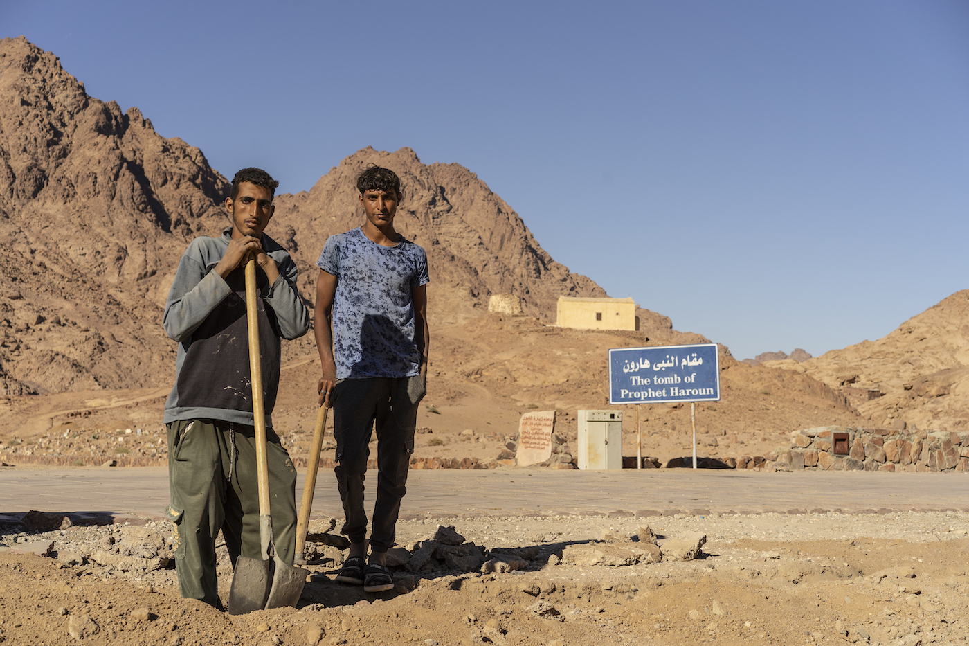 Luxorko bi egiptoar, Aaron profetaren hilobitik hurbil bideak konpontzen. (Miguel Fernandez Ibañez)