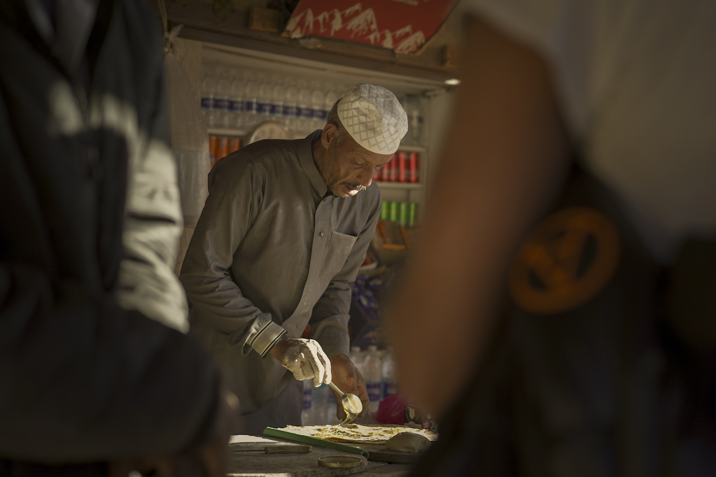 Beduino bat, ezti eta gazta krepeak prestatzen turista talde bati. (Miguel Fernandez Ibañez)