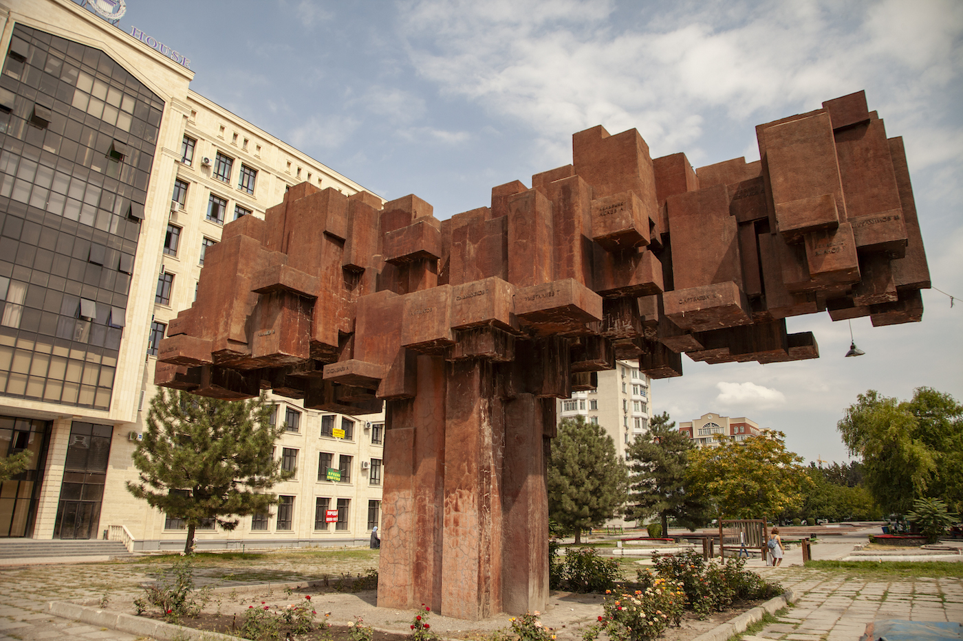 peraren Jauregi neoklasikoak Victoria plazarako bidean harrapatu gaitu, Bigarren Mundu Gerraren oroimenezko plaza nagusirako bidean, sobietar forma argiko estatuekin, pebeteroarekin eta yurta baten egitura estilizatu eta minimalista handiarekin.