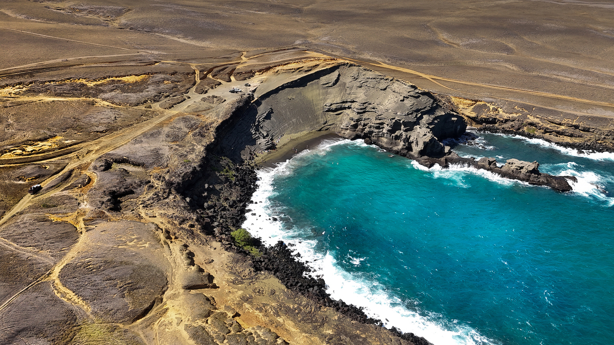 Papakolea hondartza berdea, Ozeano Barean, Ameriketako Estatu Batuetako punturik hegoaldekoenean. (Tiki Tales Films | Getty Images)