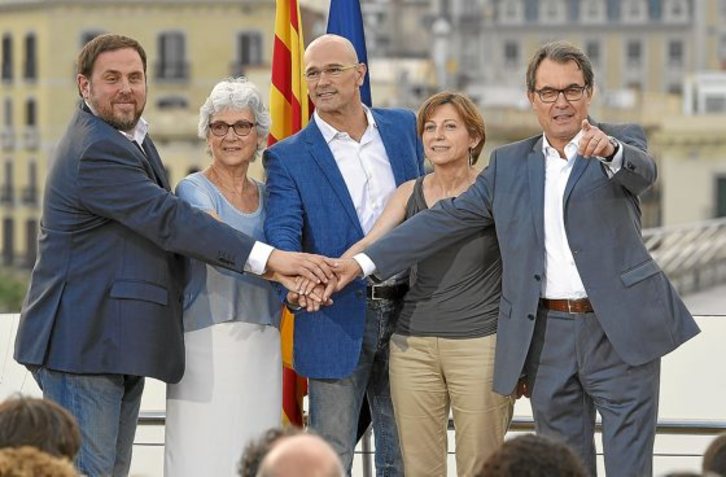 El acuerdo era más que conocido, pero hubo que esperar hasta el día de ayer para ver la foto. En la terraza del Museo de Historia de Catalunya y ante la atenta mirada de los ilustres asistentes y de los sufridos periodistas, cinco personas escenificaron el acuerdo sellado por CDC y ERC (con el visto bueno de las entidades soberanistas) para convertir las elecciones del 27 de setiembre en un plebiscito e iniciar, en caso de victoria, la fase final del proceso independentista. Fueron el cabeza de lista de la candidatura y exeurodiputado de ICV-EUiA, Raül Romeva, la expresidenta de la ANC y número dos de la candidatura, Carme Forcadell, la expresidenta de Òmnium Cultural y número tres, Muriel Casals, el president de la Generalitat y número cuatro, Artur Mas, y el líder de ERC y número cinco, Oriol Junqueras. El nombre de la candidatura: ‘Junts pel Sí’.