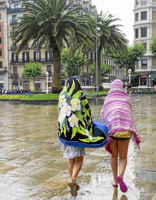 Después del sol y el calor de los días pasados, llegó la tormenta. Y aunque los servicios meteorológicos ya habían avisado de lo que se nos venía encima, al parecer los nubarrones, rayos, truenos y chaparrones pillaron a más de uno de imprevisto. Como las dos mujeres de la imagen captada en la donostiarra plaza de Okendo, hubo muchas personas que abandonaron deprisa y corriendo los arenales vascos una vez empezó a descargar; y como a la playa no se va con paraguas, en una situación así la toalla puede servir perfectamente como improvisado chubasquero. Todo vale para tratar de resguardarse.