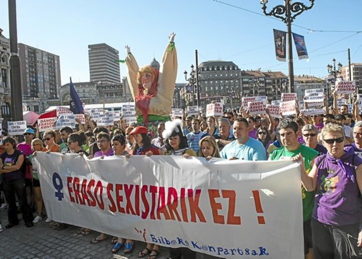 Dos centenares de personas –entre ellas, la pregonera y la txupinera– participaron ayer a la tarde en el Arriaga en la concentración convocada por Bilboko Konpartsak para denunciar dos agresiones sexistas. Llamaron a «no bajar la guardia» ante los comportamientos machistas.Monika DEL VALLE | ARGAZKI PRESS