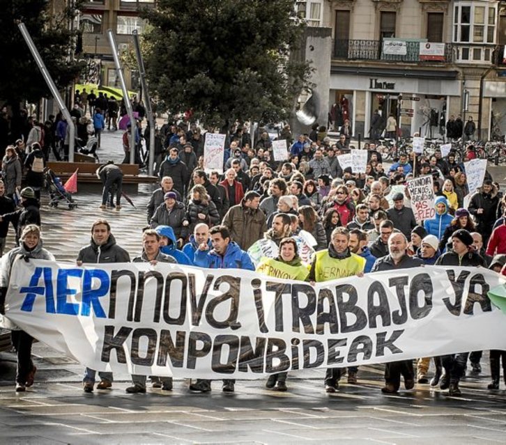 Tras una pancarta en la que se leía «Aernnova. Trabajo ya. Konponbideak», los manifestantes recorrieron el centro de la ciudad para reclamar a la dirección que aclare sus intenciones respecto al futuro de la empresa y de los puestos de trabajo.