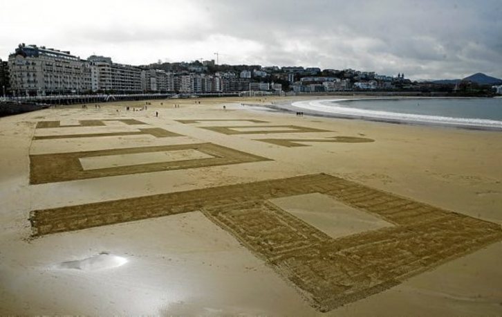 Con ocasión de la cumbre de París sobre el cambio climático, miembros de Eguzki confeccionaron ayer por la mañana un lema gigante en la Concha con el texto “CO2 stop”. El CO2 o dióxido de carbono es el gas de referencia entre los que contribuyen al efecto invernadero.