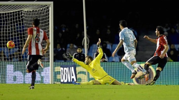 A los pocos minutos, nueva contra rojiblanca y Aduriz que no acierta a pasar el balón en clara superioridad de jugadores frente al rival. Al poco, centro lateral del donostiarra y Williams que no llega de cabeza, salvando Sergio el peligro. Tramo de agobio para los de Eduardo Berizzo que pronto retomaron el control de la pelota, pero ante un equipo bilbaino que parecía afinar mejor tras cada robo. Y así fue. Casi media hora de partido, Raúl García que se hace con una pelota en la medular, inicia la contra con un pase abierto a Aduriz, el de Antiguoko que ralentiza lo suficiente para esperar la llegada del navarro al área, le asiste y éste con el exterior salva la salida del portero. Gol y a defender la ventaja con uñas y dientes, ayudados también por esa estadística que dice que el Celta es el equipo que más balones ha estrellado en el poste. Hugo Mallo se coló hasta la cocina, chutó y entre Iraizoz y el palo hicieron bueno el gol de Raúl.