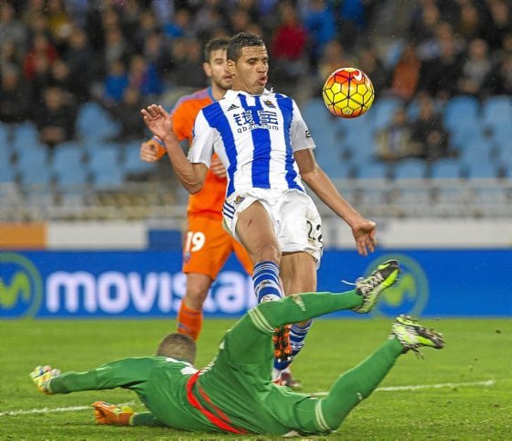 El lateral navarro ya protagonizó la mejor ocasión de la primera parte al rematar al poste tras recibir un pase de Xabi Prieto, aunque debió buscar una mejor opción que le ofrecía Vela. Después de subir la banda en innumerables ocasiones tuvo la energía para hacerlo con decisión en el último cuarto de hora y dar dos buenos centros con su pierna derecha. Ha sido su principal asignatura pendiente durante su carrera y en esas dos jugadas centró a la perfección.