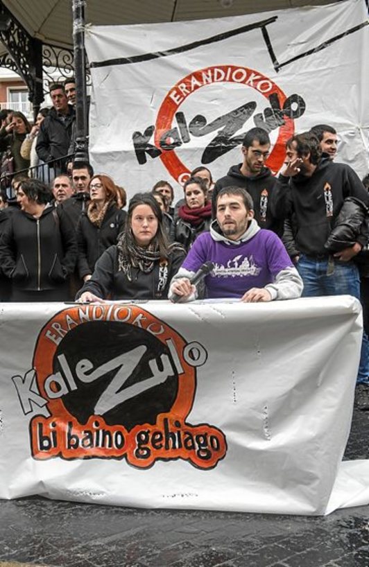 En una comparecencia realizada ayer, la asamblea juvenil de Erandio censuró el hecho de que dos vecinos del pueblo sean juzgados el 18 de enero y apuntó que estas personas no han sido elegidas por casualidad, sino «a dedo por parte del equipo de Gobierno» por «su compromiso en el movimiento juvenil durante años». Añadió que se llevará a los tribunales todo el proyecto del gaztetxe Kalezulo.