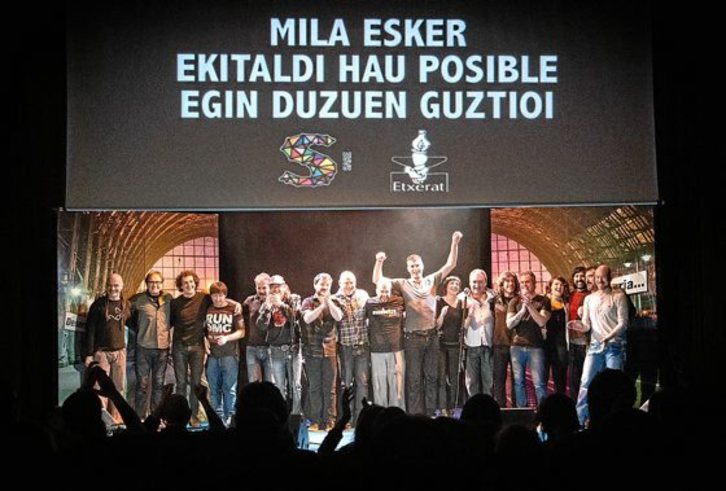 Aitor Gorosabel, Tapia eta Leturia, Naroa Gaintza, Ruper Ordorika... eta beste hainbat musikarik eta taldek bi emanaldi arrakastatsu eman zituzten igandean Etxarri Aranatzen. Sarrerak agortu zituen Sarek zein Etxeratek antolatutako ekimena zen, Bilbo eta Baionako manifestazioen biharamunean burutua. «Zama doinuz arindu» leloa erabili zuten. Irudian, kontzertuaren bukaeran.
