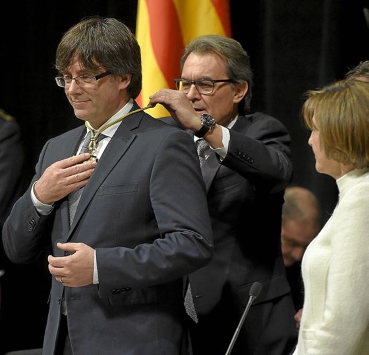 El conflicto existe, al menos a nivel protocolario. Y quien lo inició fue Felipe VI, que el lunes no quiso recibir a Forcadell y que ayer evitó agradecer los servicios prestados al president cesante, Artur Mas, tal y como dicta la costumbre. Minucias protocolarias que el ya expresident aprovechó en su breve discurso de despedida ayer: «Yo sí que os agradezco los servicios prestados», dijo, dirigiéndose a todos los que han colaborado con él durante cinco años en el Govern. Mas recordó una de las máximas que ha guiado su acción gubernamental («cabeza fría, corazón caliente, puño firme, pies en la tierra») antes de colocar a Puigdemont el medallón que simboliza la Presidencia y pasar a engrosar la lista de expresidentes. De los otros tres que siguen vivos, José Montilla y Pasqual Maragall siguieron el acto en directo. Evidentemente, no fue ninguna casualidad que Jordi Pujol no asistiese.