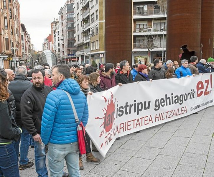 41 urteko Jose Saladino lemoarrak galdu zuen bizia lan istripuan. Urtearen lehenbiziko hamaika egunetan bi langile hil dira eta horren arrazoia «prekaritatea» da atzo Barakaldoko Bide Onera plazan bildu ziren ELA, LAB, ESK, Steilas, EHNE eta Hiru sindikatuen arabera. Azaldu zutenez, jendartearen «gaitza» da, «egoera penagarria eta onartezina». Leire Heredia ELAko Osasun arduradunak gobernuei galdetu zien ea lan politikak erabat aldatuko dituzten. Marisol RAMIREZ | ARGAZKI PRESS