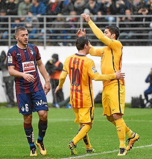 Y así fue finalmente. Aunque antes de que Luis Suárez culminara la goleada culé pasaron otras cosas. Por ejemplo, la reacción del Eibar, que durante algunos minutos se permitió soñar con la campanada. Porque mediado el primer tiempo, los armeros empezaron a acercarse al área de Claudio Bravo. Un córner, un cabezazo, un disparo lejano... No era mucho pero bastó para animar a equipo y grada, que quisieron creérselo. Y sí, durante un rato el Barcelona, que no se movió tan cómodo aunque asustó con un par de contras, pareció sufrir. Hasta que, a cinco minutos del descanso, un error incomprensible de Ander Capa dejó a Messi con el balón a pocos metros del área. No hay que ser adivino para saber cómo acabó la historia.