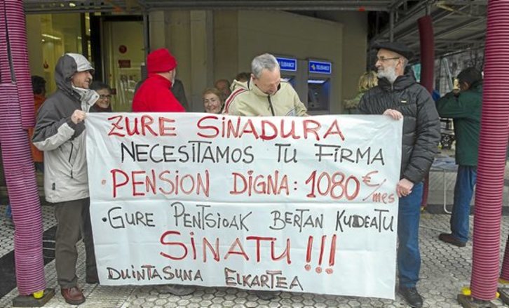 Bajo el lema ‘‘Por un sistema público de pensiones’’, integrantes de la asociación de jubilados y pensionistas Duintasuna realizaron ayer en Donostia una concentración en la que también recogieron firmas para exigir una pensión mínima de 1.080 euros. El acto se llevó a cabo ante la sede que el Banco de Santander posee en la Avenida de la Libertad de la capital guipuzcoana.