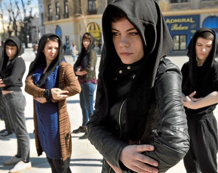 Bukaresteko kaleetan eginiko flashmob honen bitartez, amatasunari lotutako arazoen gaineko salaketa egin zuten emakume errumaniar hauek, beltzez jantzirik.Daniel MIHAILESCU | AFP