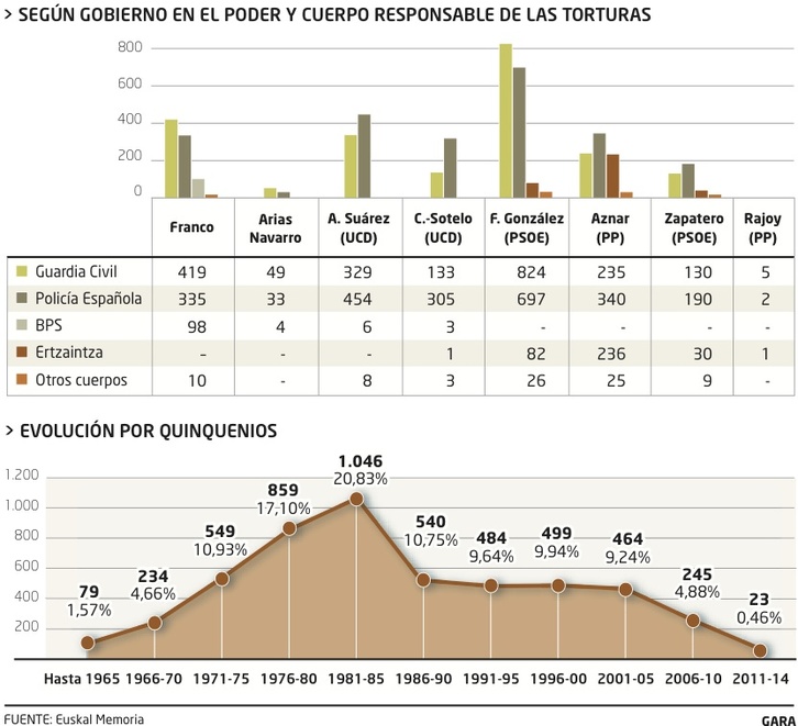 El quinquenio de estos últimos 55 años en que más casos de tortura se produjeron es el que va de 1981 a 1985. Se trata también de los «años de plomo» en que ETA provocó más víctimas mortales (casi 200 en ese lustro). Del mismo modo, cuando menos ejemplos se registran es en las épocas en que su acción armada se ralentiza hasta llegar a desaparecer, primero con el alto el fuego de 2006-2007, luego con el de 2010 y finalmente con el cese definitivo de 2011. En el último tramo analizado, entre 2011 y 2014, se cuentan 23 casos frente a aquellos 1.046 de entre 1981 y 1985 o los 859 del lustro inmediatamente anterior.