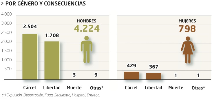 Asumiendo esa limitación, la verificación directa realizada permite no solo obtener el número de casos, sino diseccionarlos por zonas geográficas, cuerpos policiales, épocas, género de la víctima, desenlace de la detención... Y es aquí donde aparecen conclusiones nunca obtenidas hasta ahora. Una radiografía completa que se resume en estas tres páginas y de las que se pueden extraer múltiples titulares. Sobresale, por ejemplo, el dato de que el 58,40% de los casos de torturas dieron paso al ingreso en prisión, pero en el 41,32% esas personas (2.075 en concreto) quedaron inmediatamente en libertad. Cuatro de ellas murieron directamente a consecuencia de ese maltrato. Y diez casos más acabaron de otra manera: expulsión, deportación, fuga...