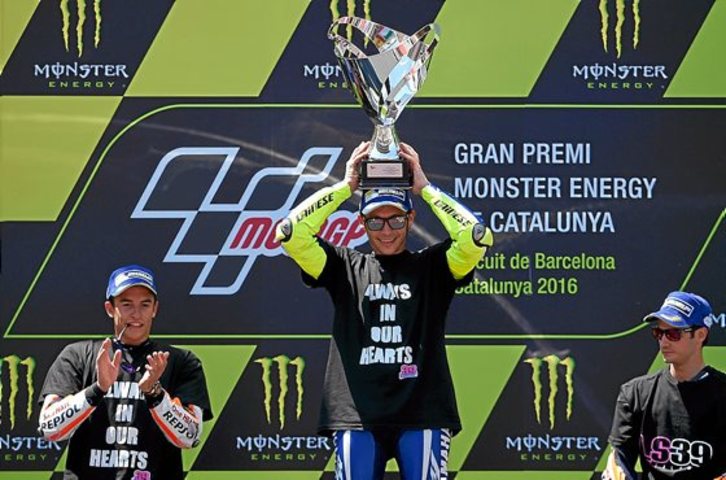 “Il Dottore” se exhibió en Barcelona, en un nuevo trazado –el de Fórmula Uno– del que renegaba solo 24 horas antes. Además, a pesar de las embestidas y ataques de Marc Márquez en las últimas cuatro vueltas, el piloto de Yamaha se aupó al primer cajón del podio. El catalán, que esta semana ha ampliado su contrato con Honda hasta 2018, fue segundo –puso el número 39 de Salom en su moto tras cruzar la meta– y pasa a liderar el Mundial de MotoGP al aprovechar el abandono de Jorge Lorenzo (Yamaha), que fue derribado por Andrea Iannone (Ducati) en una de las curvas modificadas. El balear, visiblemente enfadado, había comenzado la carrera como un tiro, pero poco a poco fue perdiendo ritmo. La tercera posición fue para el también catalán Dani Pedrosa, con lo que las Honda hicieron doblete.