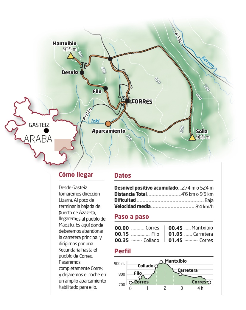 Si os animáis a combinar, aquí va la propuesta. Atravesaremos la carretera y, justo de frente, sale una pista dirección este. De esta manera, sin más complicaciones, llegaremos al cordal del monte Soila. Simplemente nos resta avanzar dirección sur por el sendero que bordea todo el cordal hasta dar con la cumbre. Desde la cumbre volveremos sobre nuestros pasos para encontrar, casi inmediatamente, un desvio a la izquierda que baja. Este desvio muere en una pista. Seguiremos bajando por dicha pista hasta aparecer de nuevo en Corres. Para realizar esta ascensión necesitaríamos emplear unas dos horas más.