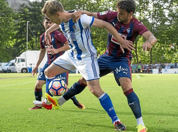 Pese a verse mejor, el Eibar tampoco llegó con excesiva claridad, con lo que el marcador no se movió en los primeros 45 minutos. Sí lo hicieron ambos equipos, y de arriba a abajo, en el descanso. Pero el encuentro se reinició en términos similares. El Eibar supo plasmar mejor sus intenciones y esta vez tuvo premio. A los siete minutos del segundo tiempo, un centro de Bebé no encontró rematador. Pero ante la incapacidad de la Real para despejar el balón, los armeros remataron tres veces para que la definitiva, a cargo de Rubén Peña, rompiera la igualada inicial.