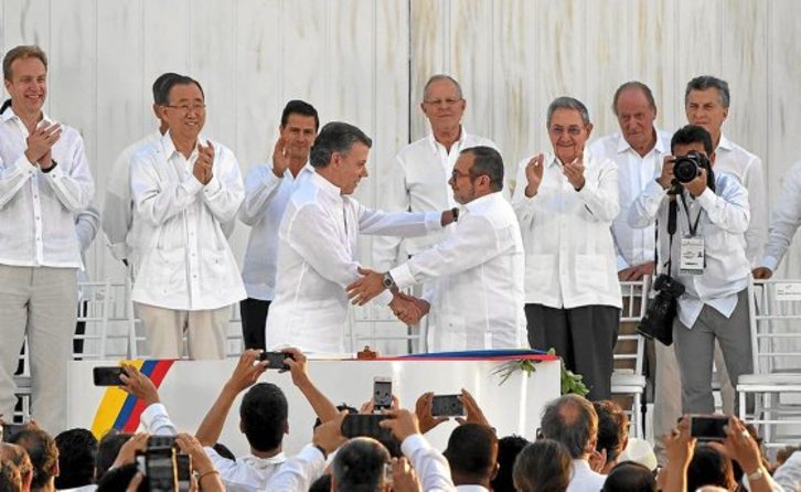 El Gobierno y las FARC firmaron el 26 de setiembre en Cartagena el acuerdo de paz que cerraron en agosto tras casi cuatro años de negociaciones en La Habana para poner fin al conflicto armado y acabar con la guerrilla más antigua de América.