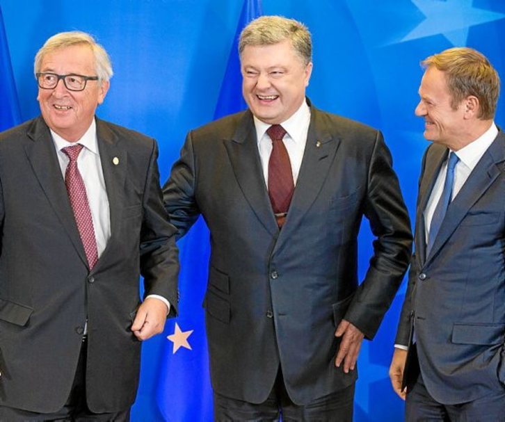 Los presidentes del Consejo Europeo, Donald Tusk, y de la Comisión Europea, Jean-Claude Juncker, prometieron ayer al presidente ucraniano, Petro Poroshenko, que resolverán el escollo de la ratificación del acuerdo de asociación y de libre comercio entre ambas partes (bloqueado por Países Bajos, que lo rechazó en un referéndum en abril) y el fin de los visados a los ucranianos antes de final de este año. «Sé que mere- céis más, también de nosotros, de Europa», afirmó, al término de la 18 cumbre bilateral, el presidente del Consejo Europeo, que justificó los retrasos por las «limitaciones» europeas y negó cualquier «mala intención».