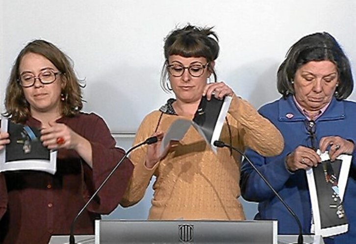 Mireia Vehí, flanqueada por Anna Gabriel, Gabriela Serra, Joan Garriga, Benet Salellas y Eulàlia Reguant, que sostenían fotografías de Felipe de Borbón boca abajo, aseguraron que, frente a la «mano dura» que aplica el Gobierno español contra los impulsores del proceso independentista, los anticapitalistas no piensan dar «ni un paso atrás». Acto seguido, hicieron pedazos las fotografías.