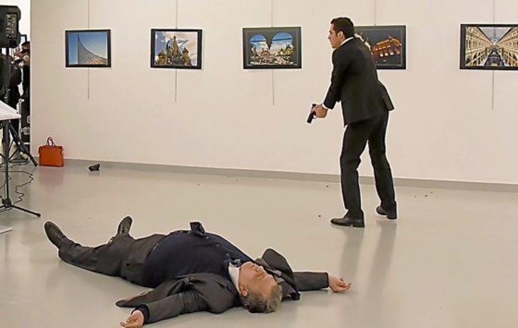Un policía turco de 22 años mató ayer al embajador ruso en Turquía, Andrei Karlov, gritando consignas a favor de Alepo y de Siria, mientras éste inauguraba la exposición fotográfica «Rusia: De Kaliningrado a Kamchatka». El tirador, identificado como Mevlüt Mert Altintas y que llevaba dos años y medio en las fuerzas antidisturbios, fue abatido por otros agentes que acudieron al lugar.
