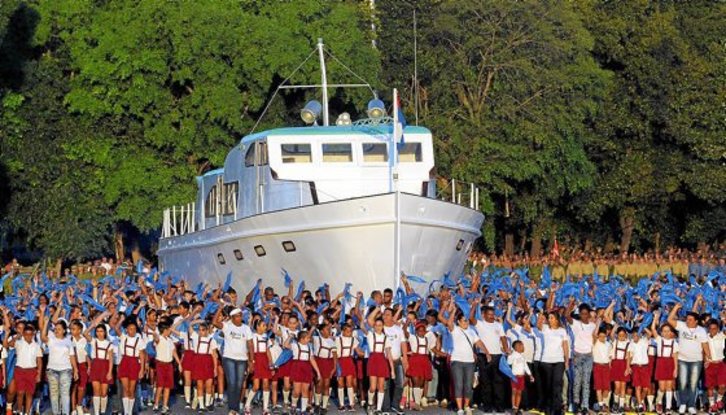 Les siguió, escoltado por más de tres mil niños de uniforme agitando sus pañuelos azules, la réplica a escala del “Granma”.