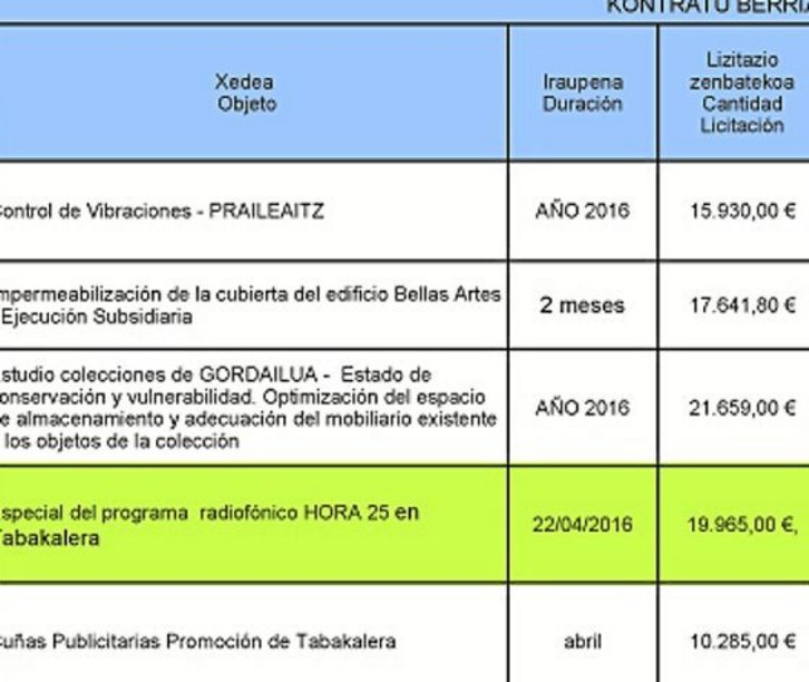 Preguntado en noviembre pasado al respecto por el grupo foral de EH Bildu, Itxaso explicó que esta decisión se tomó para «apoyar la proyección y conocimiento de un equipamiento cultural que constituye la gran apuesta cultural del territorio de esta década». Asimismo, aseguró desconocer las cuantías abonadas a otros medios, de lo que cabe deducir que «Hora 25» fue el único programa contratado por su Departamento.