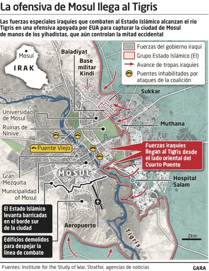 La estrategia de las fuerzas gubernamentales pasa por recuperar primero el este de la ciudad y, una vez asegurada esta ribera del Tigris, iniciar la captura del oeste, la zona más amplia y densamente poblada de Mosul. Con la toma de los dos puentes, que unen al norte y al sur las dos partes de la ciudad, crece el optimismo en torno a una pronta caída de los tres restantes.