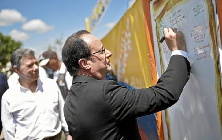 El presidente francés, François Hollande, calificó ayer el proceso de paz de Colombia como un ejemplo para el mundo y prometió que su país continuará dando su ayuda en el periodo de posconflicto, en su visita a una de las zonas de desmovilización de las FARC.