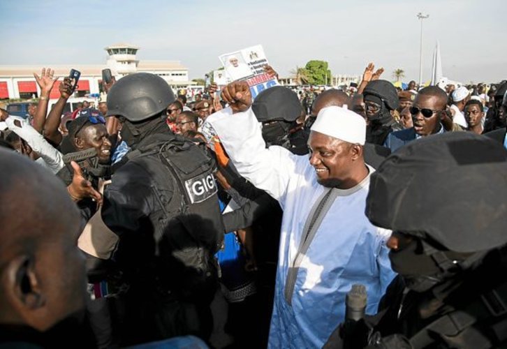 Cientos de personas esperaban con júbilo la llegada del nuevo presidente, ante un gran dispositivo de seguridad desplegado en la capital gambiana, en un día considerado por muchos ciudadanos como «histórico» y en el que vestían camisetas con el lema «Gambia has decided» (Gambia ha decidido).