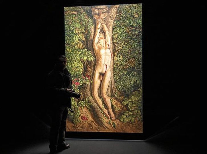 Martiri paganoa margotu du. Bi odol zauri ditu, ezker besapean eta zilbor ondoan bana. Ez da, ordea, zerk eragin dizkion ikusten. Eskumuturrak zuhaitzari lotuta ageri da, hil aurretik, minaren eta plazeraren artean. «Aurpegian estasi ia sexuala ageri da», zehaztu zuen komisarioak. Argiztapena oso urria da, nor bere baitara biltzera gonbidatzen duen eszenografia bati erantzunez. «Ipar Euskal Herriko kapera baten tonua. Lebitatu eta bakarrik egon dadin».