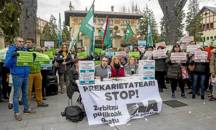 Bere ardurapeko esparruetan «negoziazio kolektiborako eskubidea deuseztatzea» egotzi dio ELAk Iñigo Urkulluren gobernuari. Ajuria Enea aitzinean egindako protestan, 21.000 lanpostu galdu direla eta hiru langiletik bat aldi baterakoa dela agertu du sindikatuak.