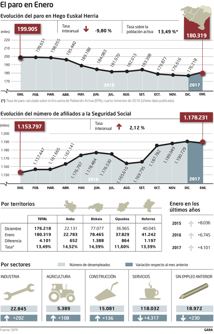 Ciertamente, en años anteriores el habitual incremento de enero ha sido mayor y en términos interanuales la cota de desempleo ha descendido notablemente en el conjunto de Hego Euskal Herria, puesto que la cifra de personas en paro registradas oficialmente ha pasado de 199.905 a 180.319. No obstante, son 4.101 más que en diciembre.
